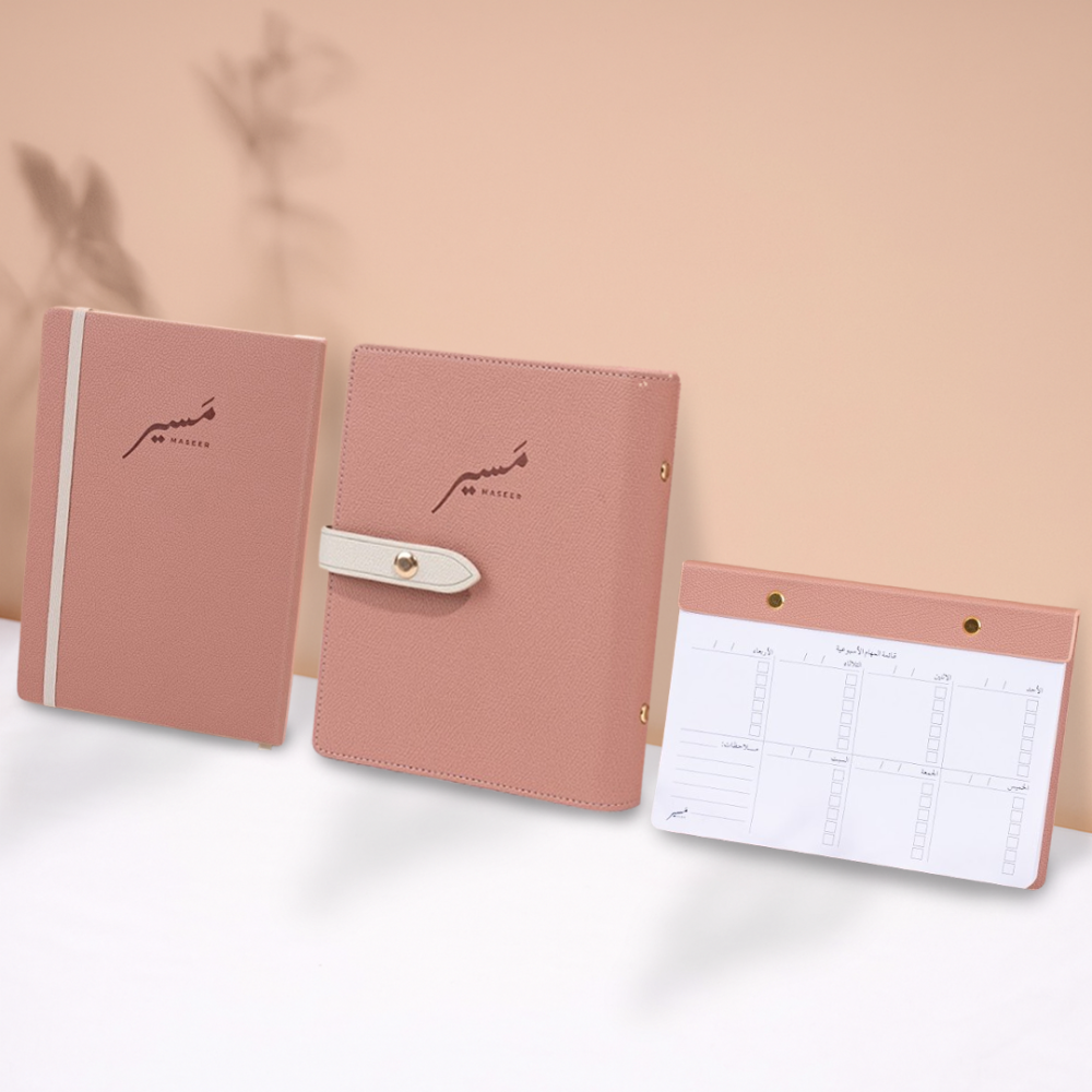 مفكرة مسير الغير مؤرخة هي رفيقك المثالي للتخطيط الشخصي، مصنوعة من جلد فاخر وبخط عربي فصيح، تساعدك على تنظيم يومك وأسبوعك وشهرك، مع إرشادات تحفيزية تعزز تقدمك. وتتميز بورق كريمي عالي الجودة، فاصل ورقي فاخر، مساحات حرة للكتابة، حامل قلم مرن، وجيوب متعددة. تتوفر خدمات إضافية مثل حفر الاسم على الجلد، صندوق إهداء أنيق، وبطاقة إهداء، مما يجعلها هدية مثالية لك ولمن تحب.