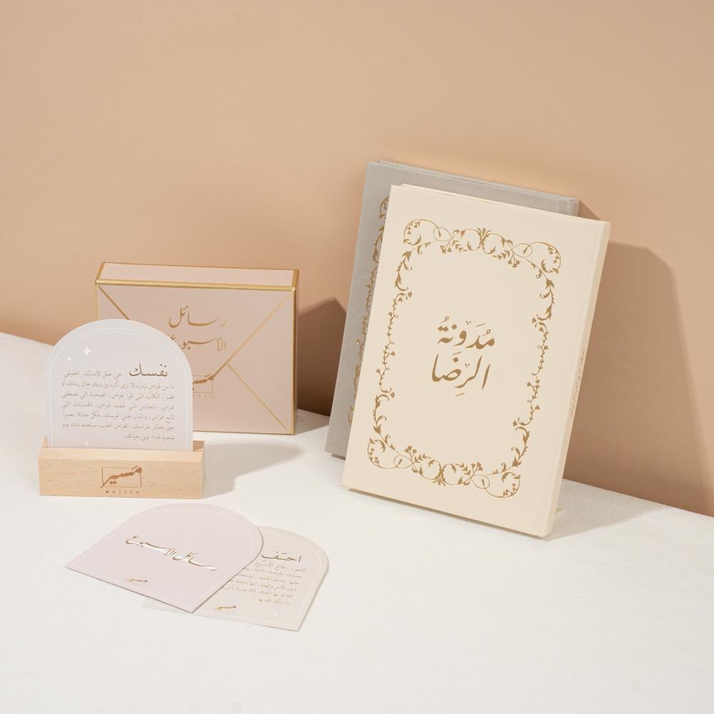 - مدونة الرضا: اجعل الامتنان عادة يومية مع مدونة الرضا، رفيقك الشخصي الذي يدعوك لتدوين النِعم الصغيرة، واللحظات الجميلة، والزهور المختبئة في ثنايا يومك. هذه المدونة بمقاسها العملي A5 (14.8 × 21 سم) توفر لك مساحة يومية للتعبير عن رضاك، وتغذية آمالك، وتنعش روحك.