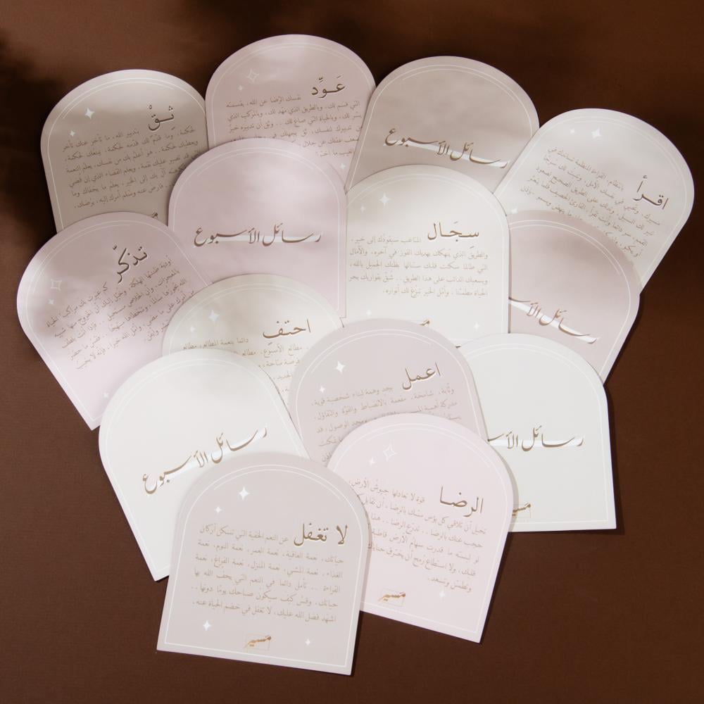 - رسائل الأسبوع: أشعل شرارة الإلهام والتفكير الإيجابي كل أسبوع مع 48 بطاقة محفزة وملهمة تغطي عدد أسابيع السنة. تأتي هذه البطاقات في صندوق خاص وحامل بطاقات خشبي أنيق، لتكون تذكيرًا بصريًا دائمًا برسالتك الإيجابية الأسبوعية.